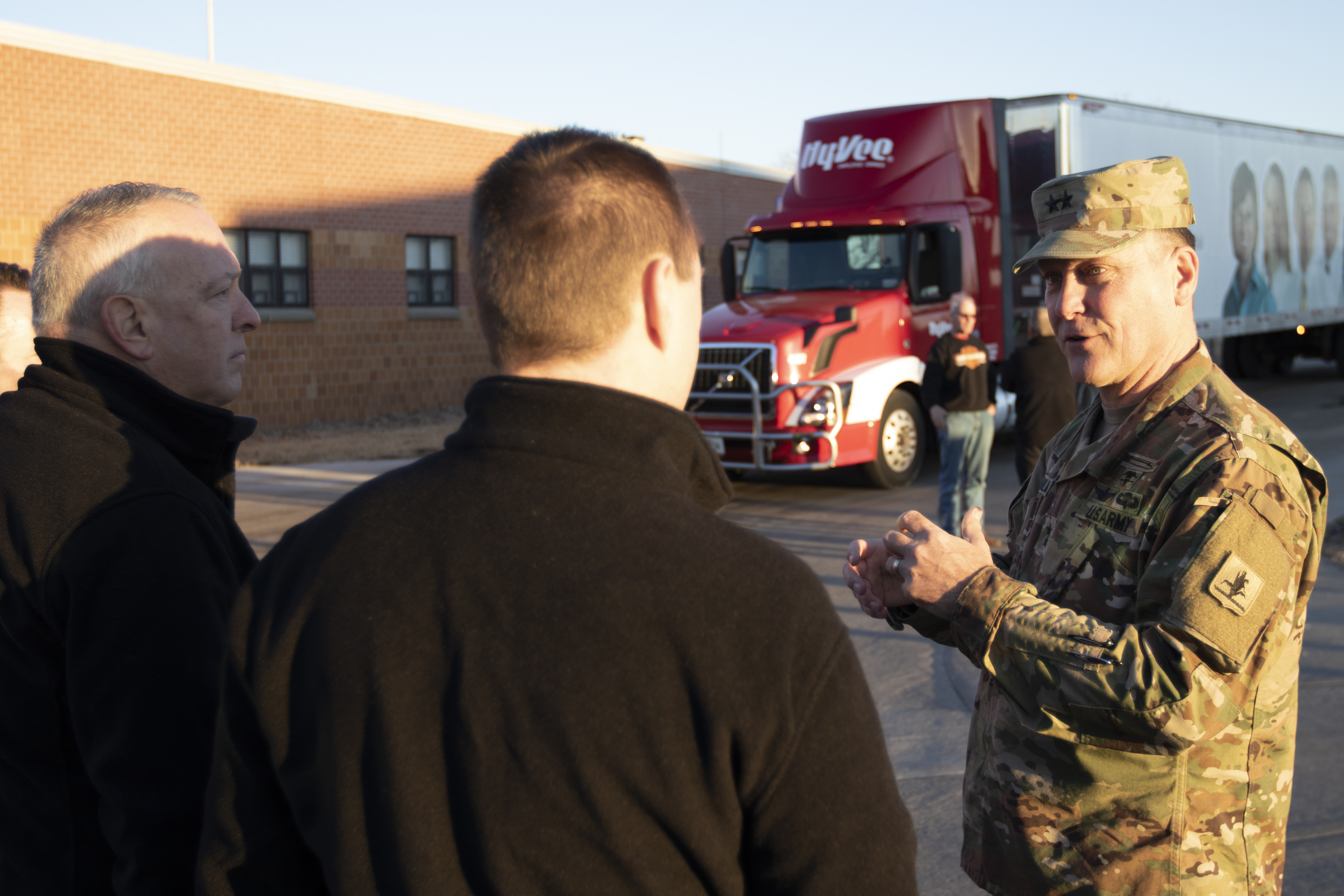 The largest transport of flood-related relief items occurred on March 17, when the Nebraska National Guard joined with the Department of Transportation, Nebraska State Patrol and Hy-Vee to deliver eight truckloads of food donated by Hy-Vee, and two fuel tankers to support three shelters in the isolated town of Fremont. To access Fremont, which had essentially become an island after floodwaters closed all roads surrounding the town, the Nebraska Department of Transportation used snowplows to push enough mud around to create a central access road open only for official vehicles. Nebraska National Guard Soldiers joined the convoy, driving Light Medium Tactical Vehicles, carrying pallets of food and water, as well as medical supplies for the Fremont Health Medical Center.