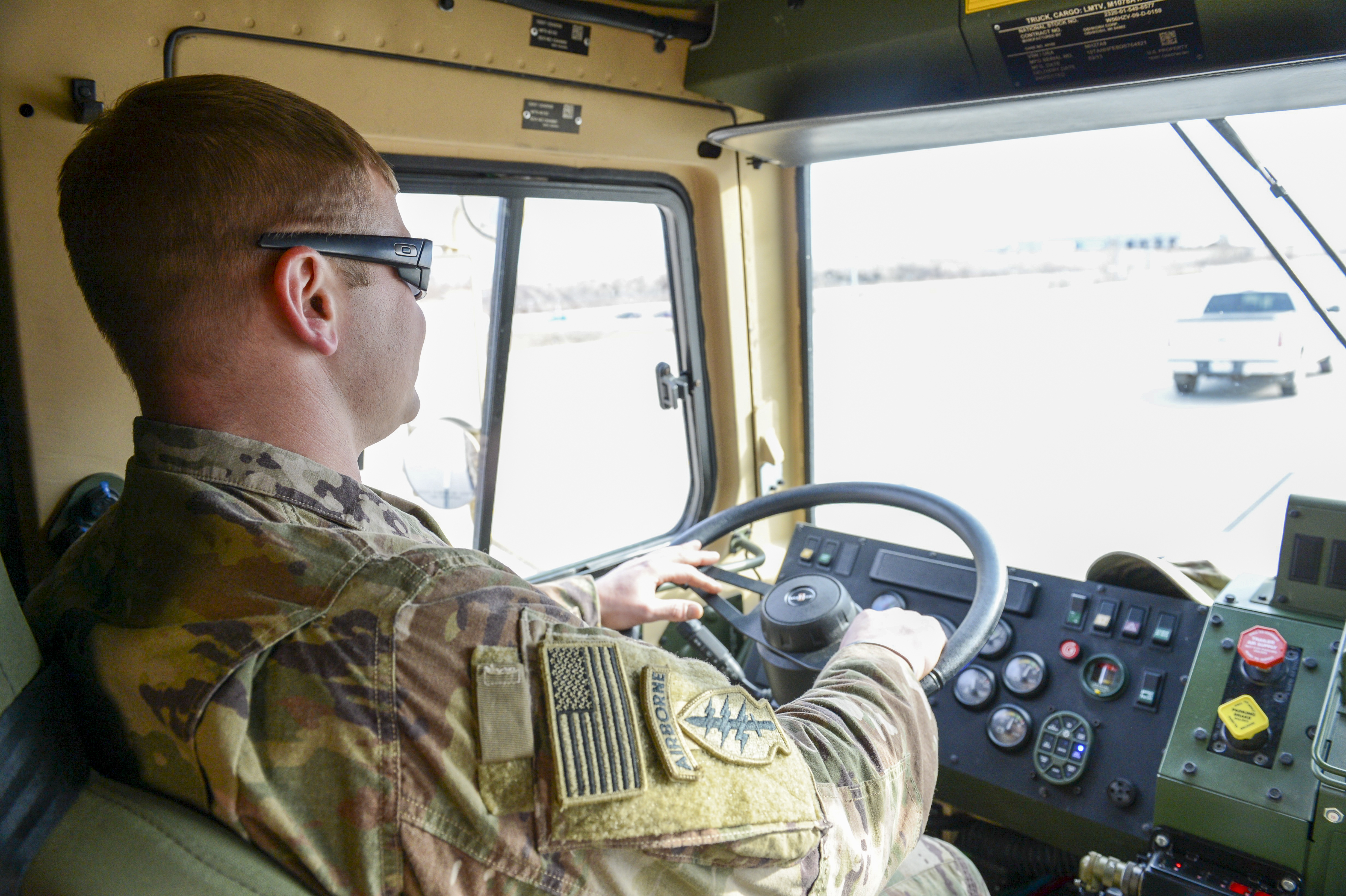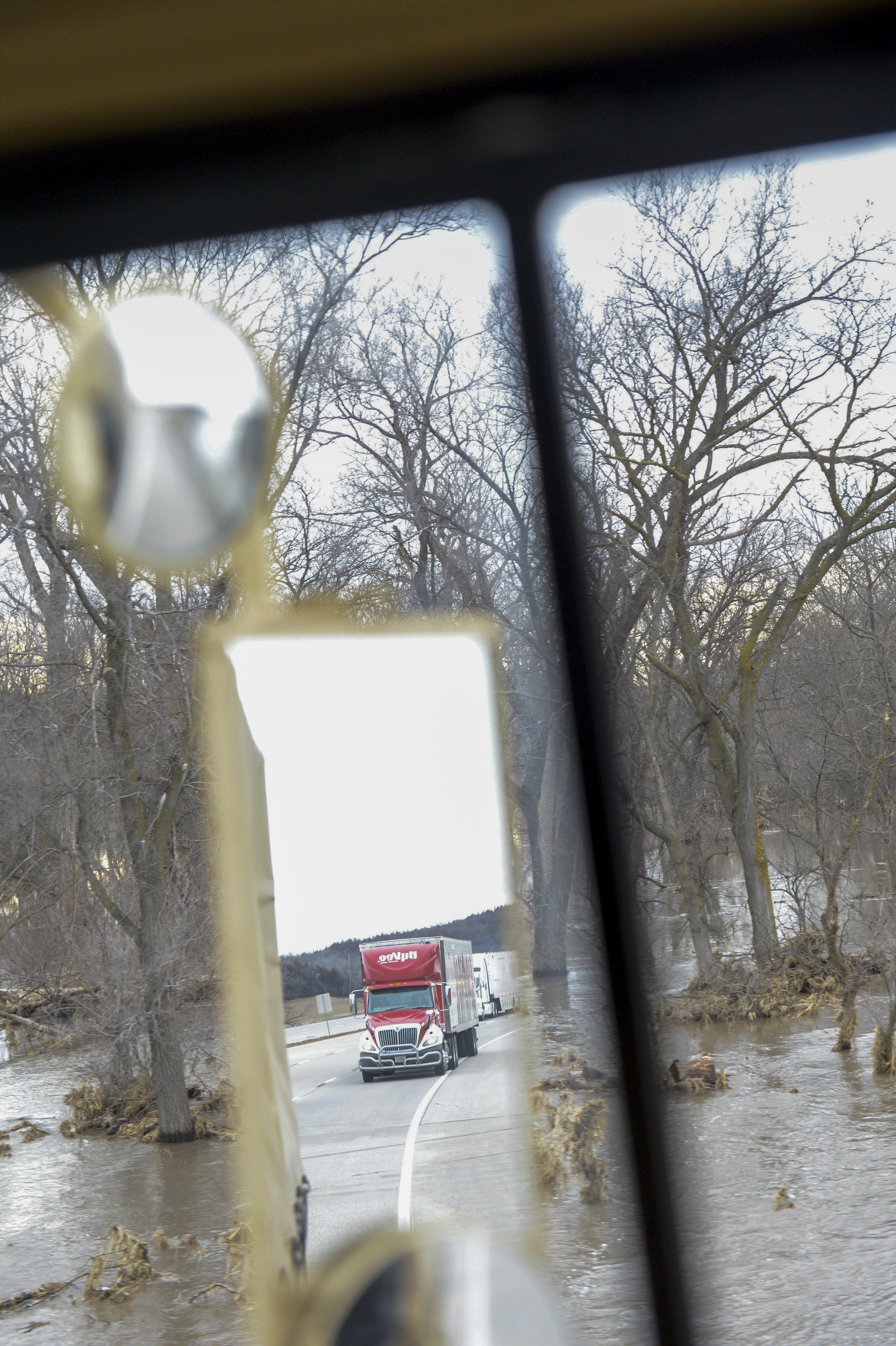 Sgt. 1st Class Kyle Schramm, a maintenance section sergeant, 195th Forward Support Company, Omaha, drives a Light Medium Tactical Vehicle as part of a convoy headed to Fremont, Nebraska, March 17, 2019. The convoy delivered needed food and water to the citizens of Fremont. (Nebraska National Guard photos by Staff Sgt. Natasha Hilsgen)