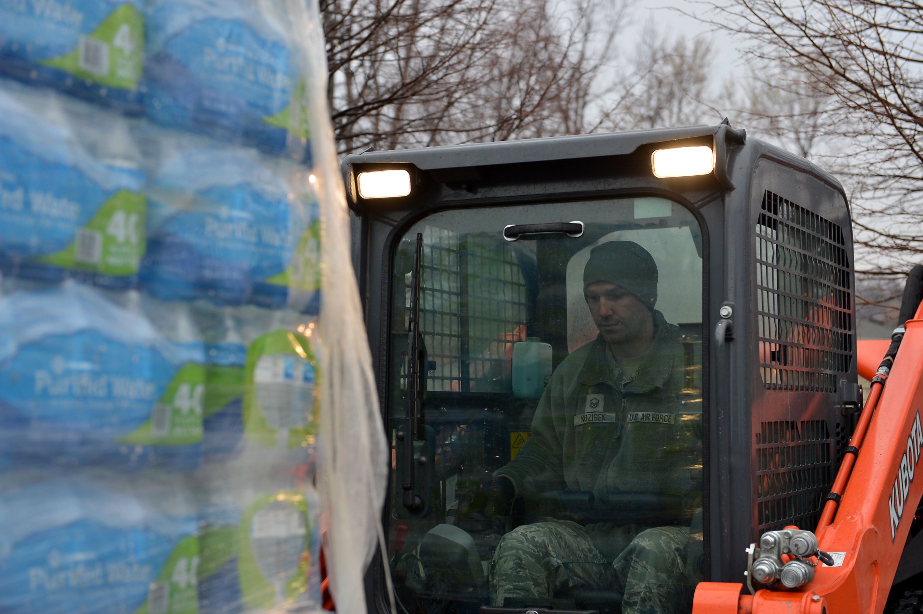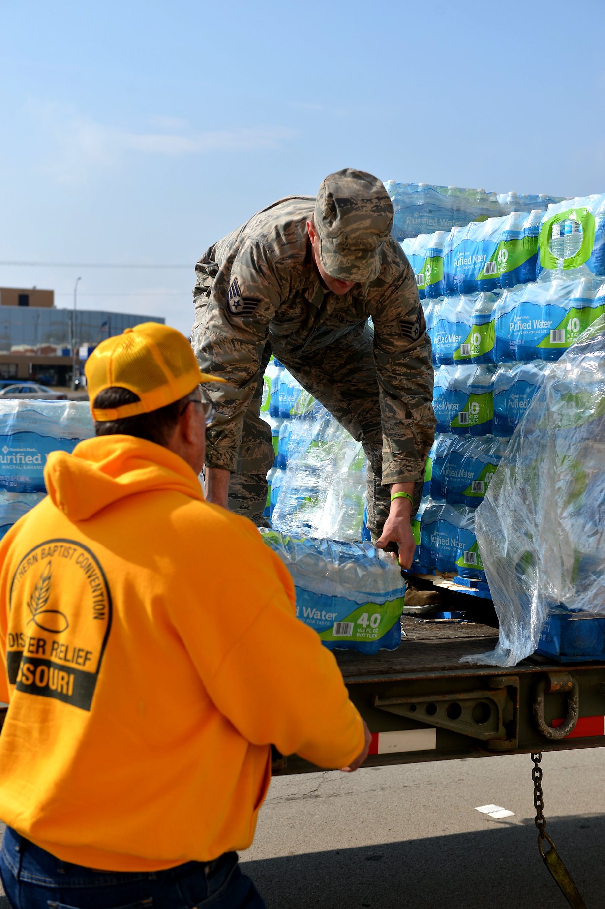 Nebraska National Guard Airmen with the 155th Logistics Readiness Squadron in Lincoln delivered 50 pallets – or about 10,000 gallons – of water to Fremont and Omaha, March 26-27, 2019, to residents in need of water safe enough to cook with or to drink.