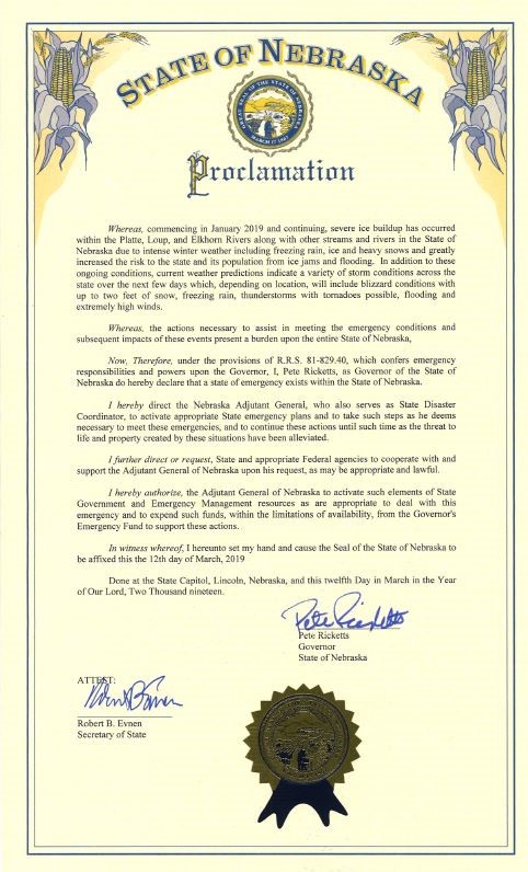 On March 12, 2019, Nebraska Governor Pete Ricketts in consultation with the Nebraska Emergency Management Agency (NEMA) issued an emergency declaration in anticipation of severe weather issues set to impact the state. The emergency declaration was issued to allow NEMA and other state agencies to address potential impacts from the impending severe winter storm expected to affect the Panhandle area, as well as anticipated flooding across other areas of the state.