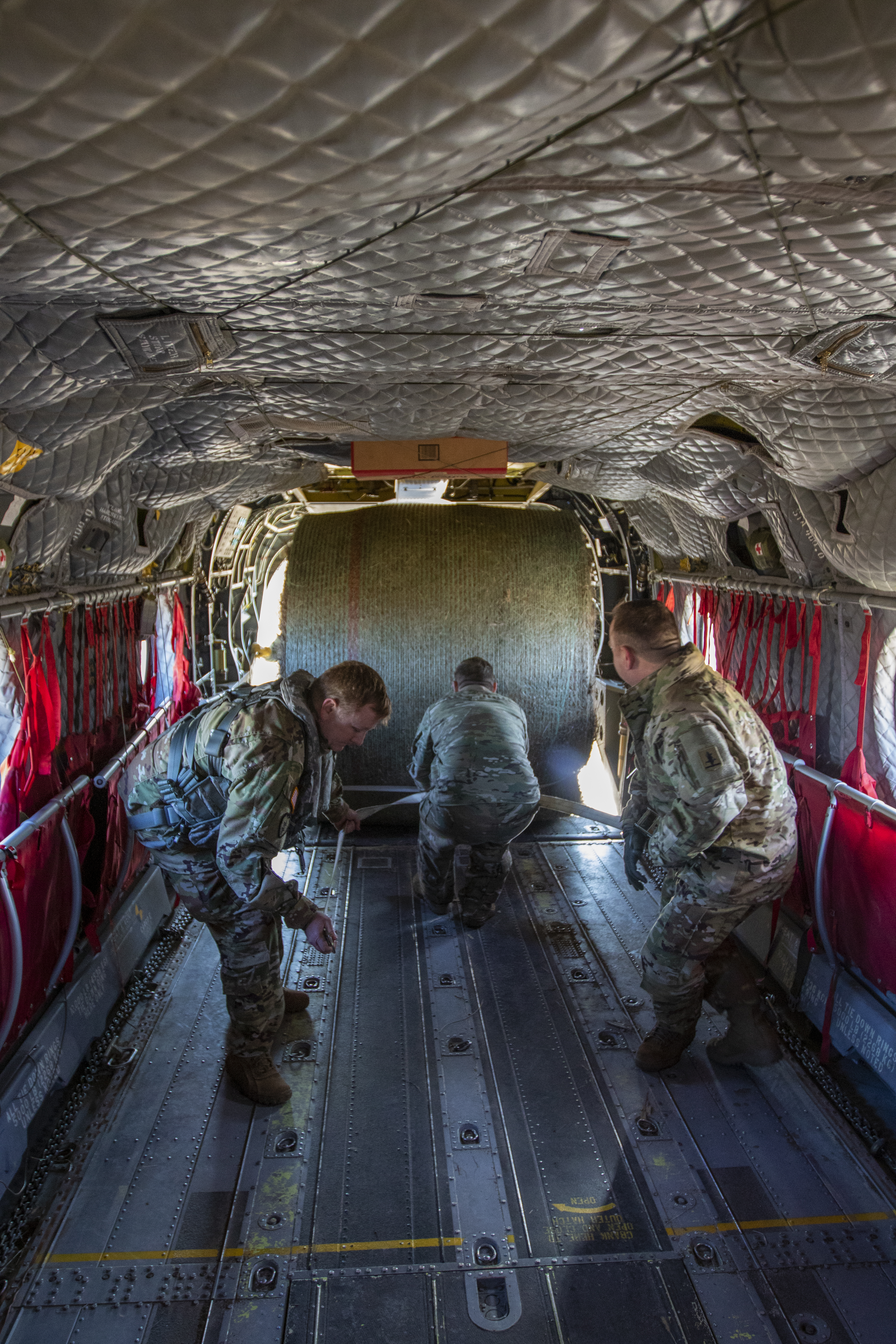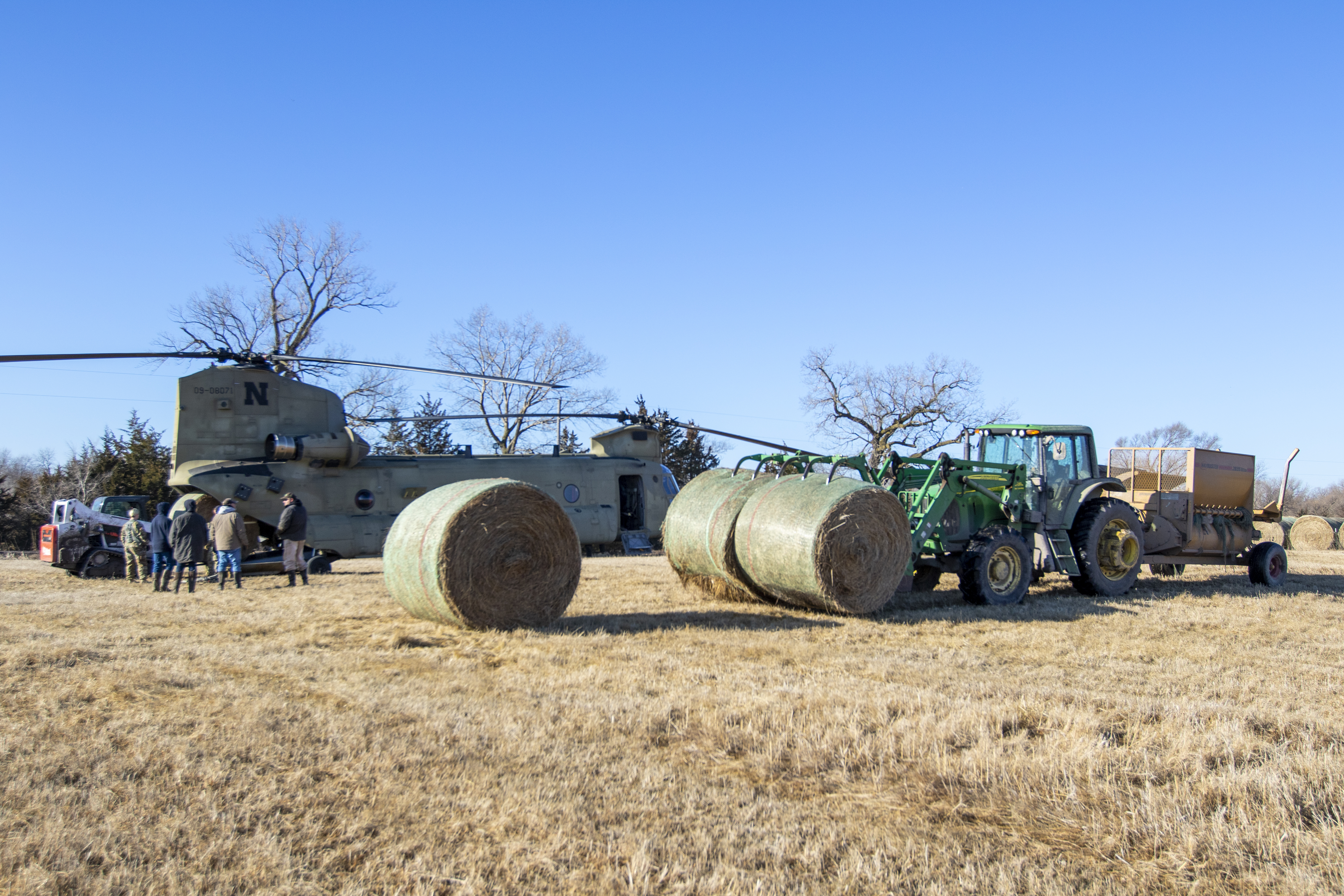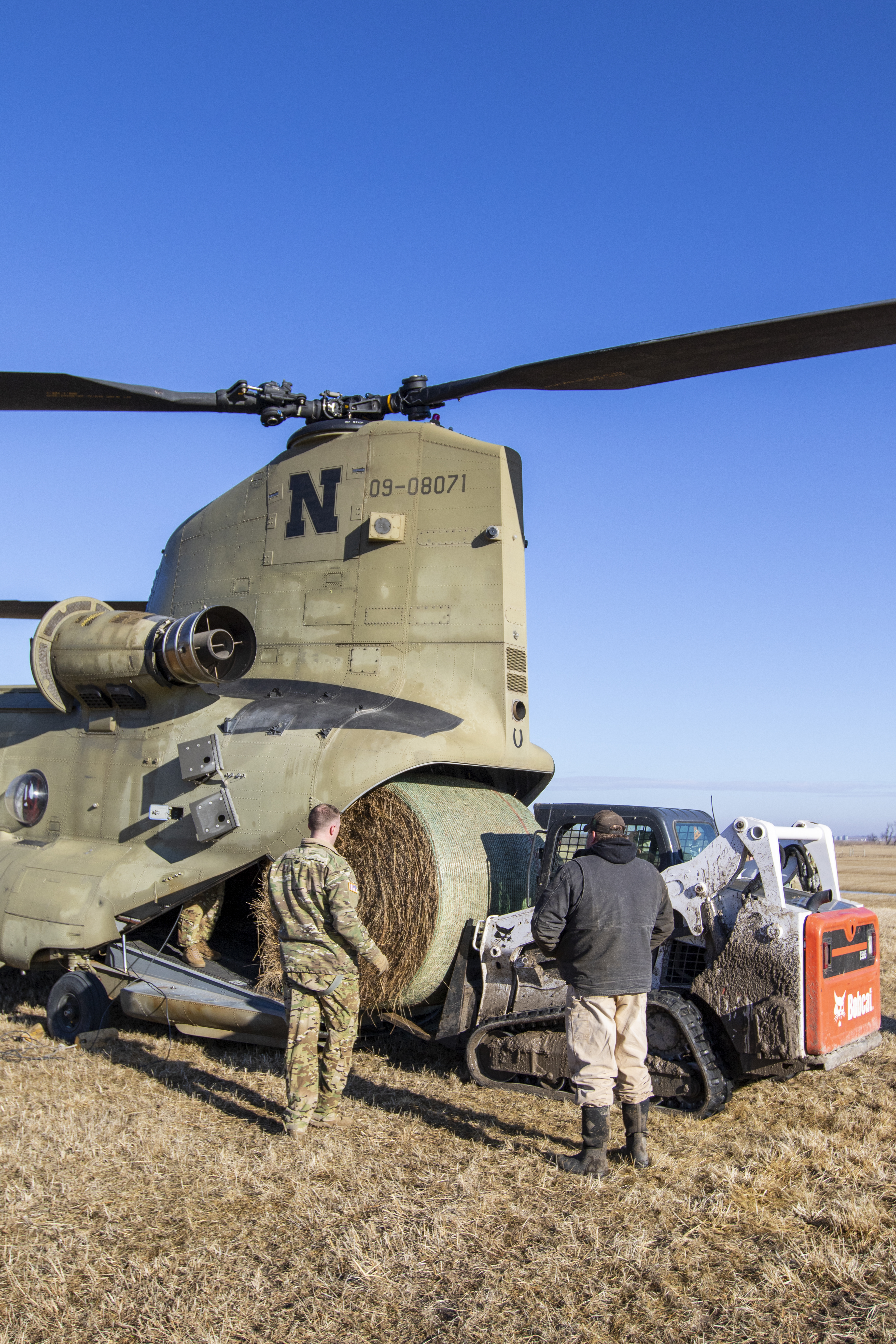 On March 20, 2019, the Nebraska National Guard made history when it used a CH-47 Chinook helicopter with Company B, 2-135th General Support Aviation Battalion, to secure and deliver 10 bales of hay, and airdrop them near Richland, Nebraska, to cattle isolated by historic flooding across the state.