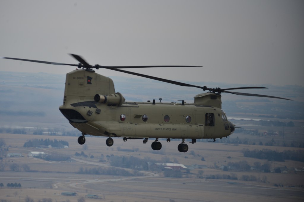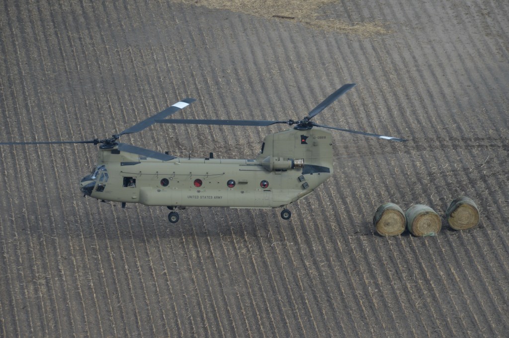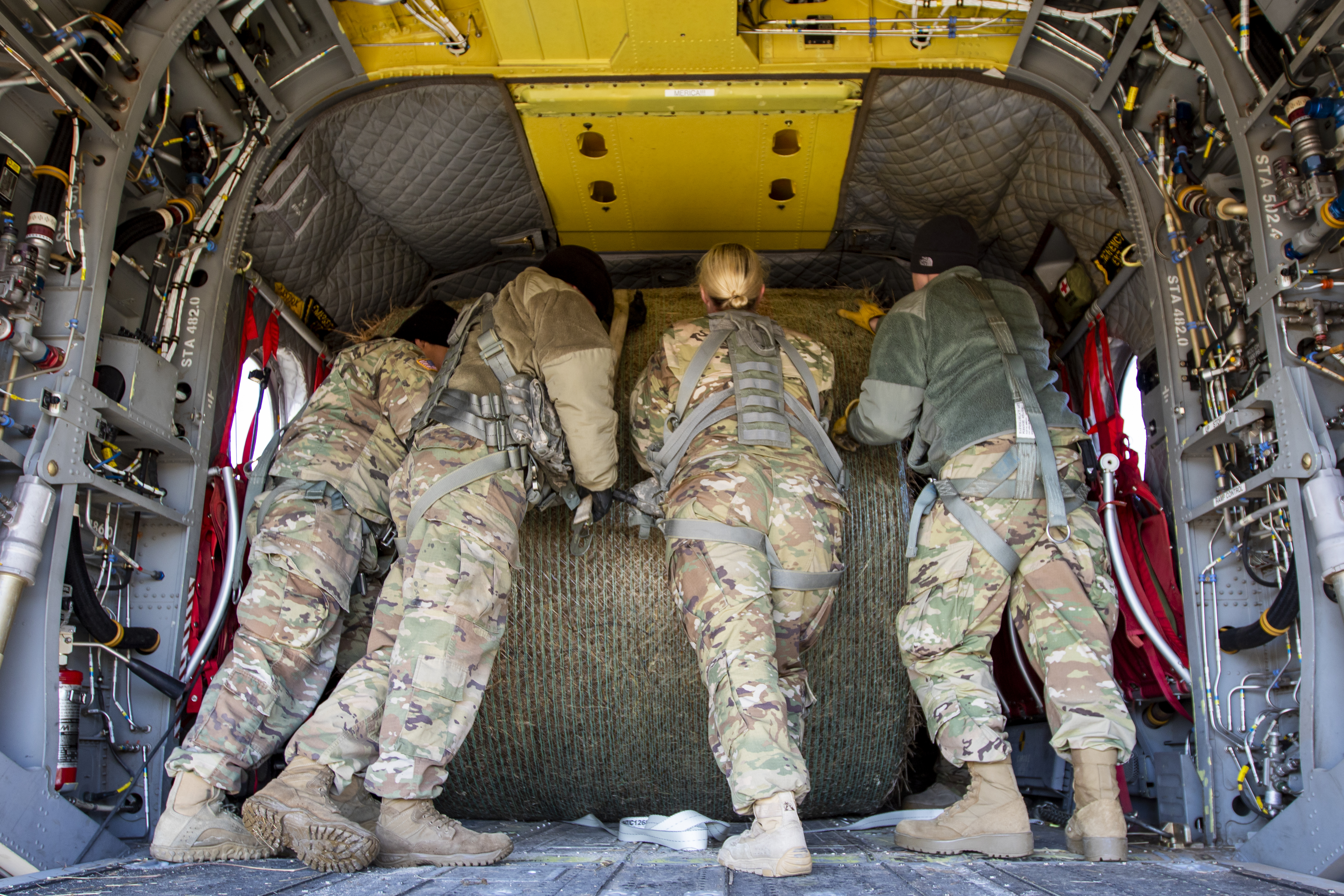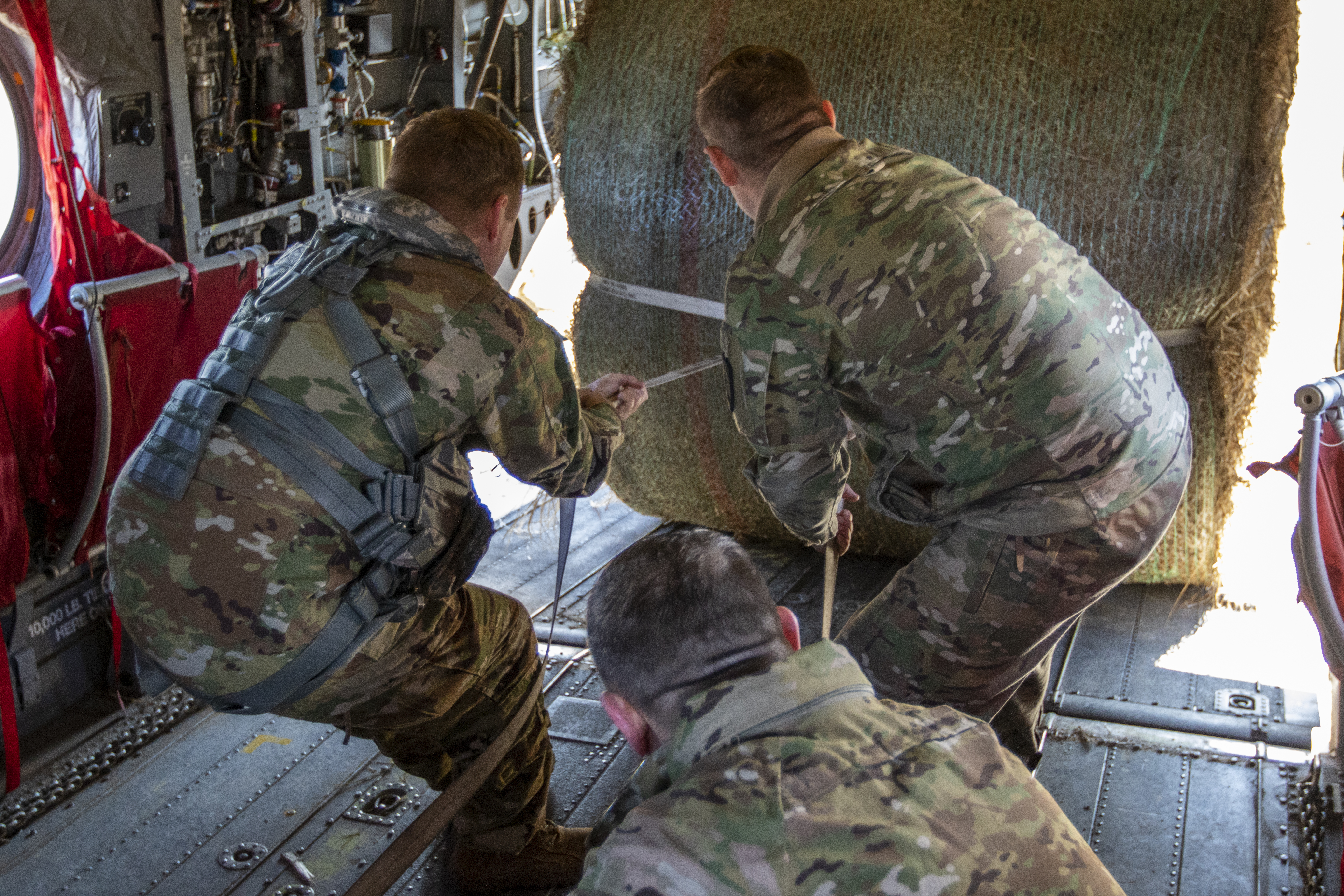 On March 20, 2019, the Nebraska National Guard made history when it used a CH-47 Chinook helicopter with Company B, 2-135th General Support Aviation Battalion, to secure and deliver 10 bales of hay, and airdrop them near Richland, Nebraska, to cattle isolated by historic flooding across the state.