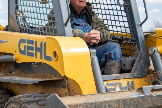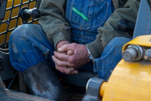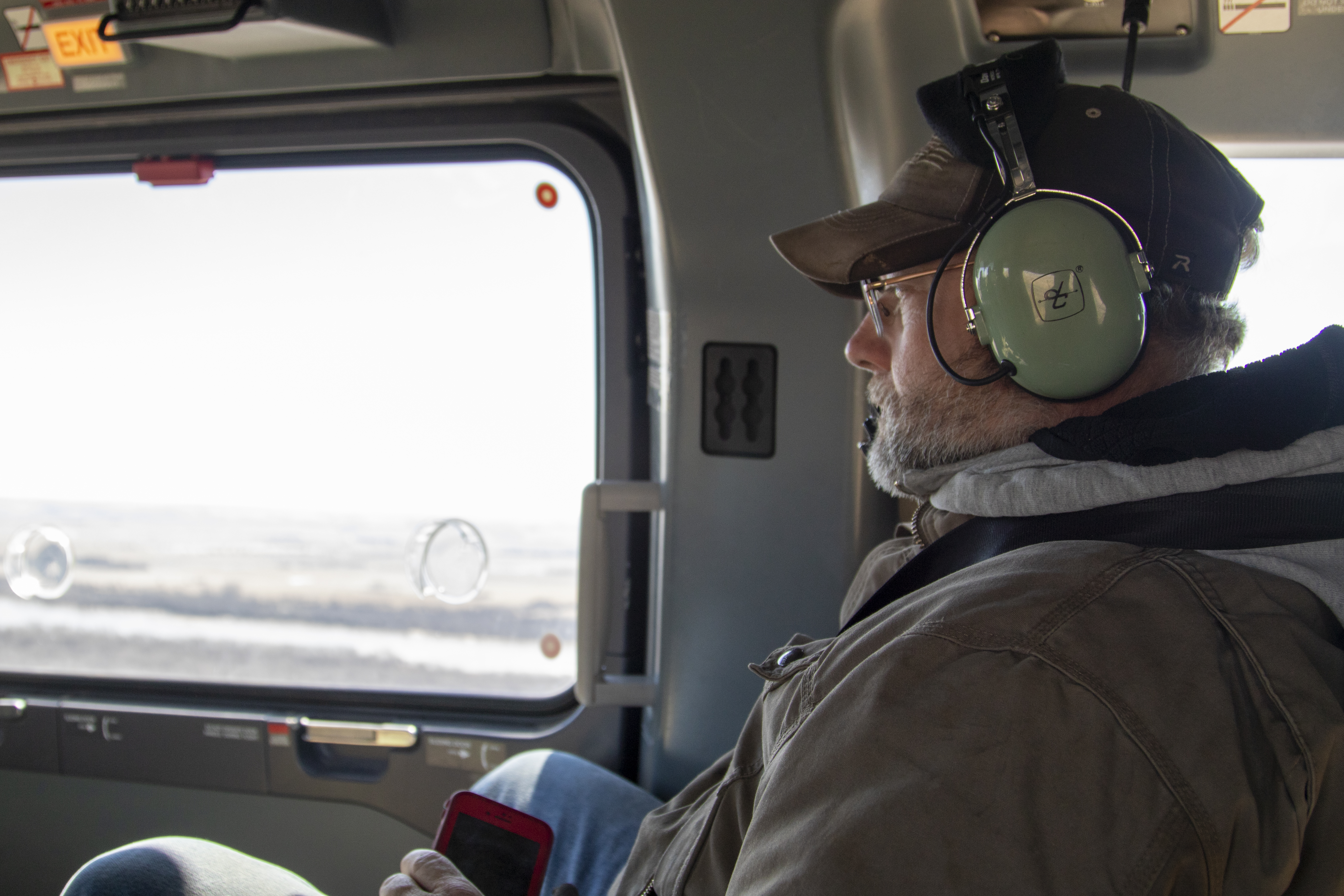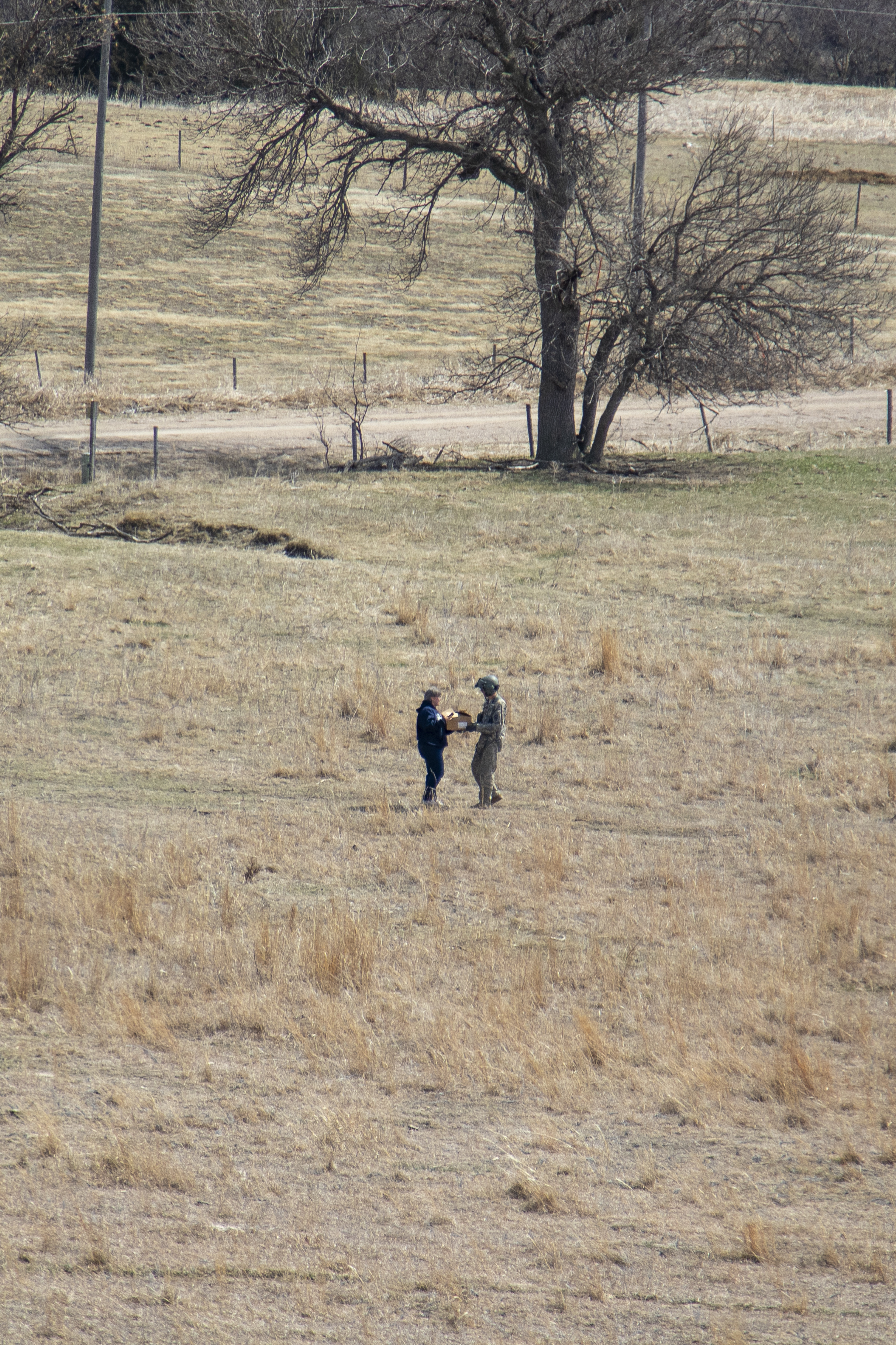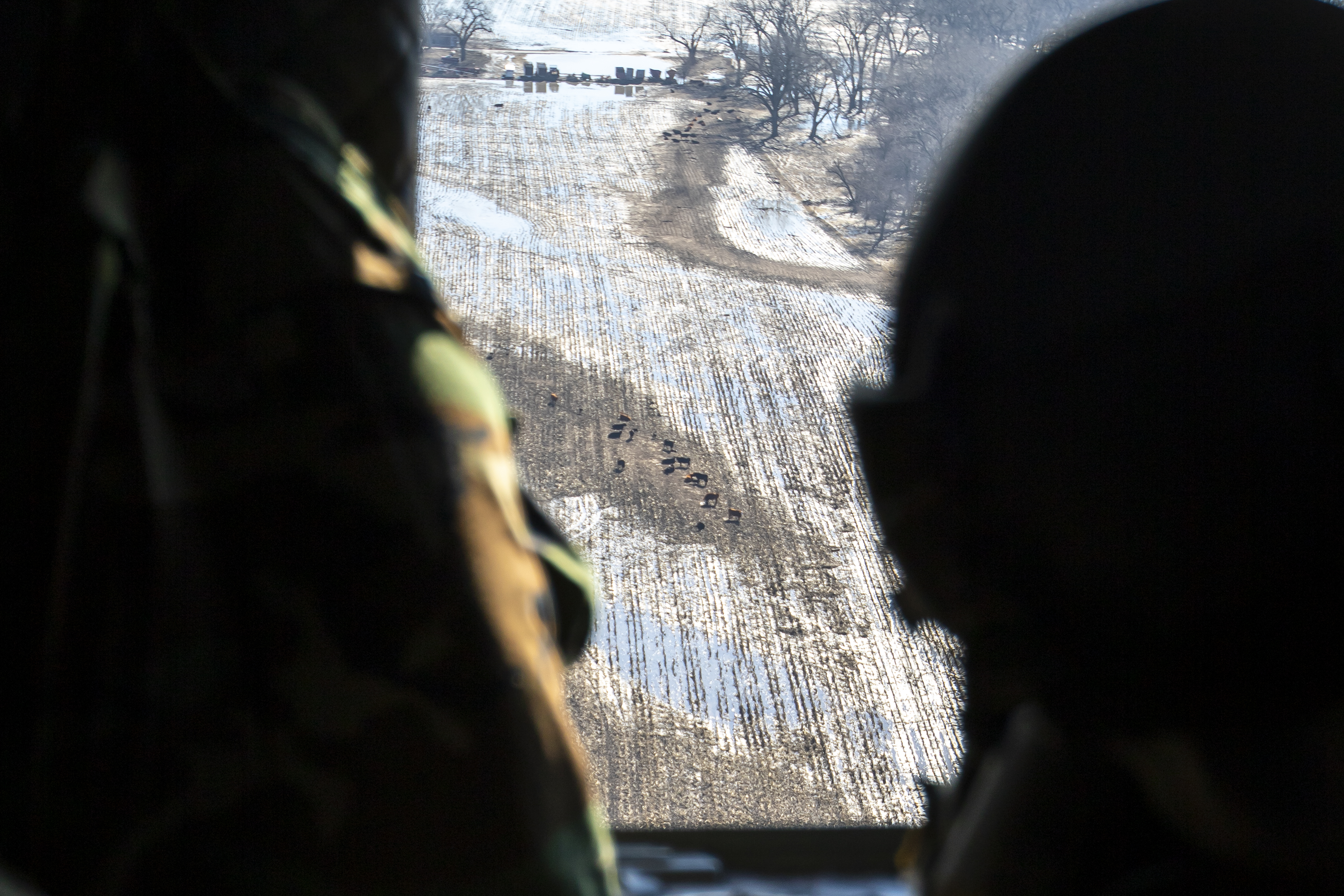 During one of the final aerial hay drops on April 1, 2019, an 81-year-old farmer near Columbus, Nebraska, patiently waited for his delivery by a Nebraska National Guard Ch-47 Chinook helicopter from Company B, 2-135th General Support Aviation Battalion, from Grand Island. The farmer here had lost cows to the winter storm, and was now running low on feed. With the roads washed out around him, he had no other way to get fresh hay to the 100-head of cattle that remained.