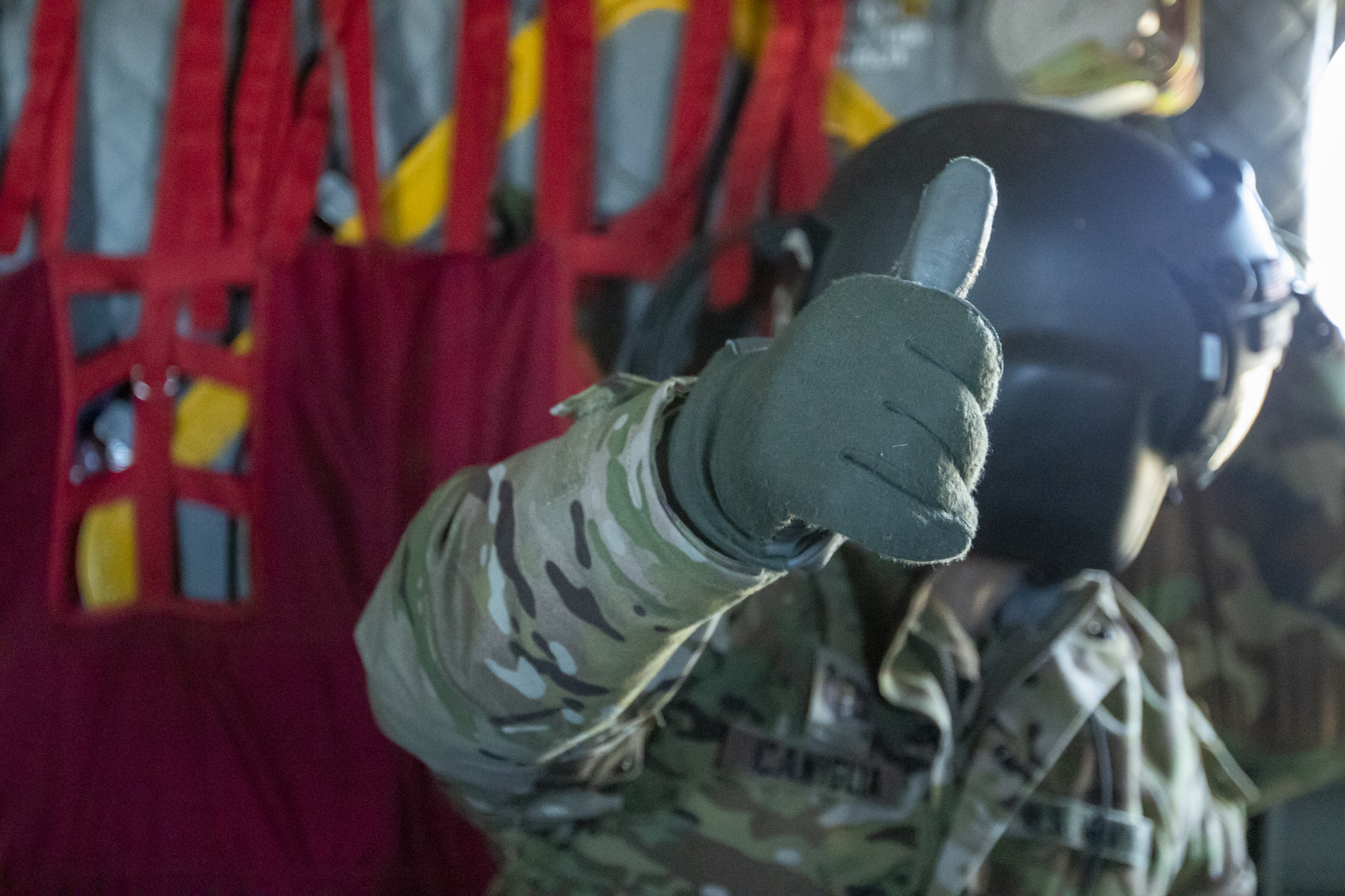 Spc. Spencer Werness with the Bravo 2-221 General Support Aviation Battalion, Minnesota National Guard gives a thumps-up in support the Operation Hay Drop from the flooding in Nebraska, March 23, 2019. The Minnesota National Guard collaborated with Nebraska National Guard in efforts to provide hay to stranded cattle across the State of Nebraska. (Nebraska National Guard photos by Senior Master Sgt. Shannon Nielsen)