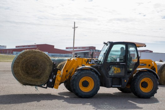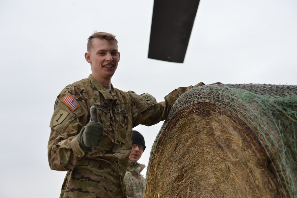 The Nebraska National Guard Soldiers picked up donated hay bales and delivered them to farmers unable to move feed to their livestock after historic flooding damaged infrastructure which limited heavy equipment movement. This time, the Soldiers were able to fly to the farm, land and then roll the large round hay bales out.