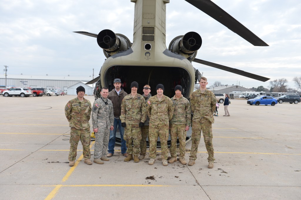 Minnesota National Guard members with the Bravo 2-221 General Support Aviation Battalion provide a CH-47 Chinook aerial support with members of the Nebraska National Guard on the second Operation Hay Drop March 23, 2019. Brian Palmer, general manager of the Platte Country Agicultrual Society who coordinated the relief efforts posed with the dream team who aided in this mission. (National Guard photos by Senior Master Sgt. Shannon Nielse)