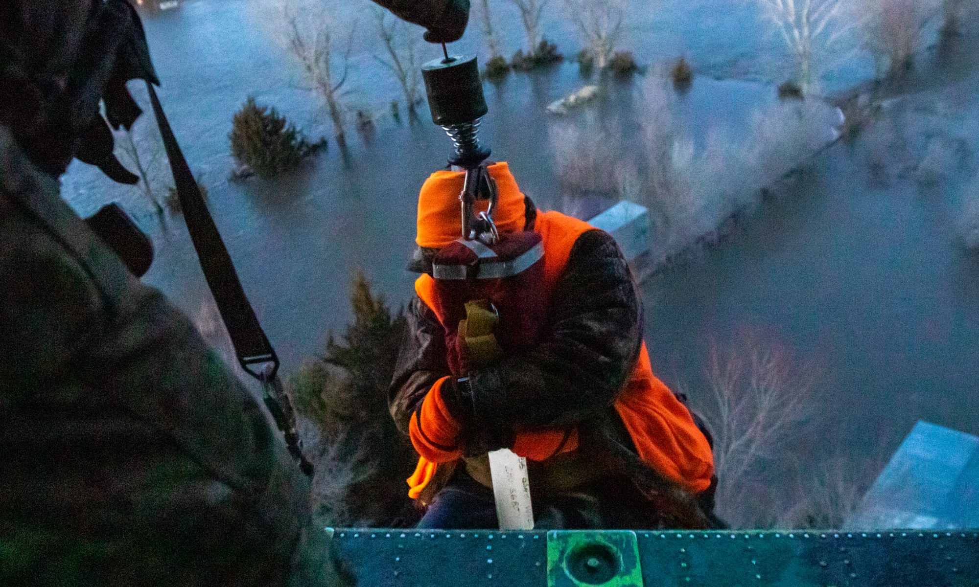 By the evening of March 14, 2019, the Nebraska National Guard began conducting search and rescue operations over some of the hardest hit areas. Using UH-60 Blackhawk helicopters, a UH-72 Lakota helicopter, and high-water vehicles, the Nebraska National Guard helped rescue 112 people and 13 pets. Of those rescues, 66 were performed using hoist mechanisms – something the Nebraska National Guard Soldiers are highly trained to execute, with many experiences supporting other states during hurricane response efforts, but virtually unheard of before within Nebraska.