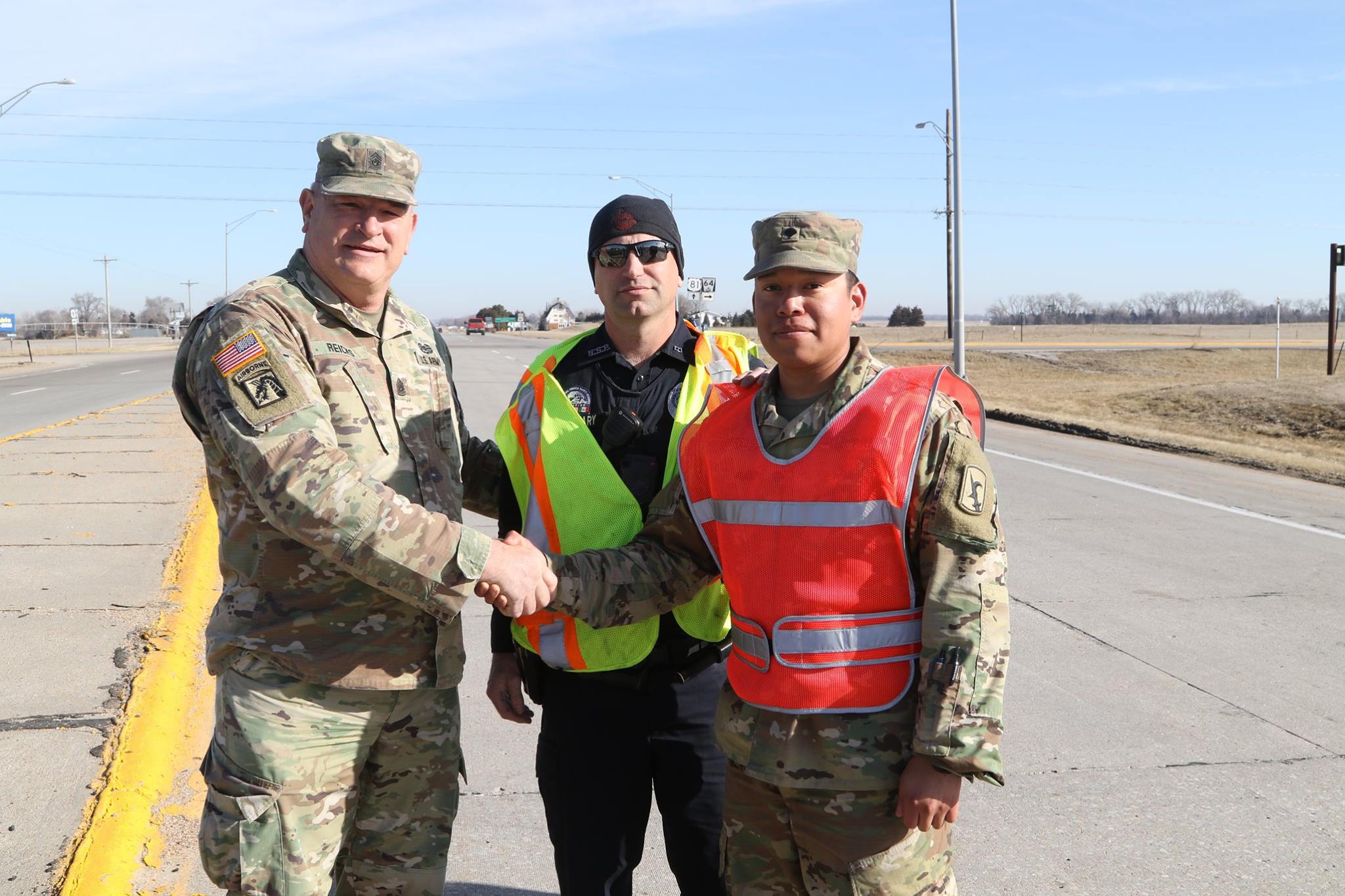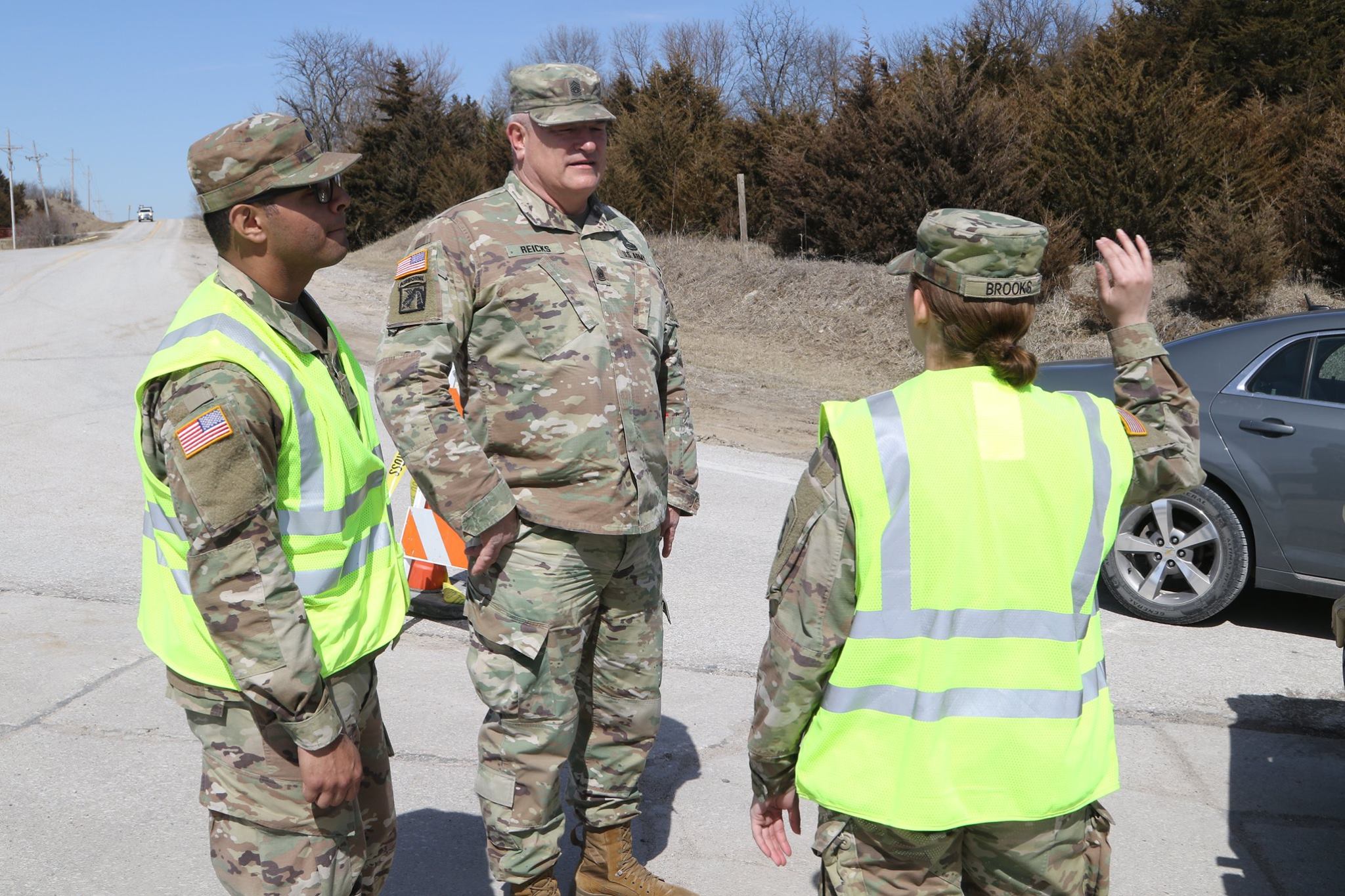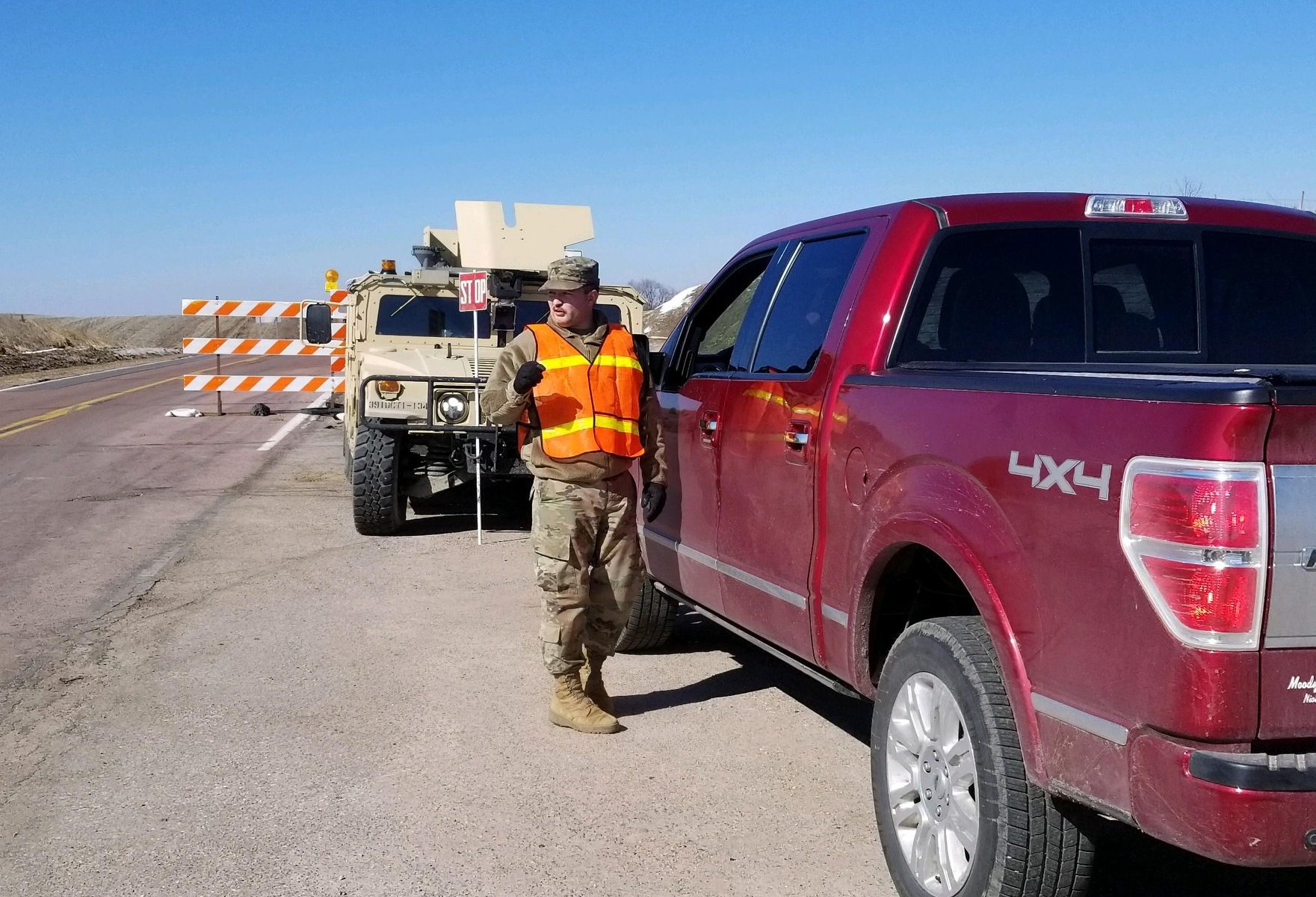 On March 22, 2019, Command Sgt. Maj. Dean Reicks, the senior non-commissioned officer for the 67th Maneuver Enhancement Brigade, toured all the locations where Nebraska National Guard Soldiers were tasked to man traffic control points throughout the state.