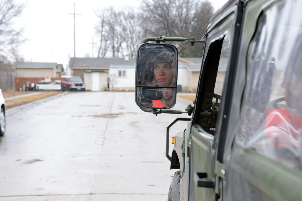 Soldiers with the 267th Small Maintenance Company, Nebraska Army National Guard, provide checkpoint security, March 19, 2019, near a mobile park in Fremont, Nebraska. (Nebraska National Guard photos by Staff Sgt. Natasha Hilsgen)
