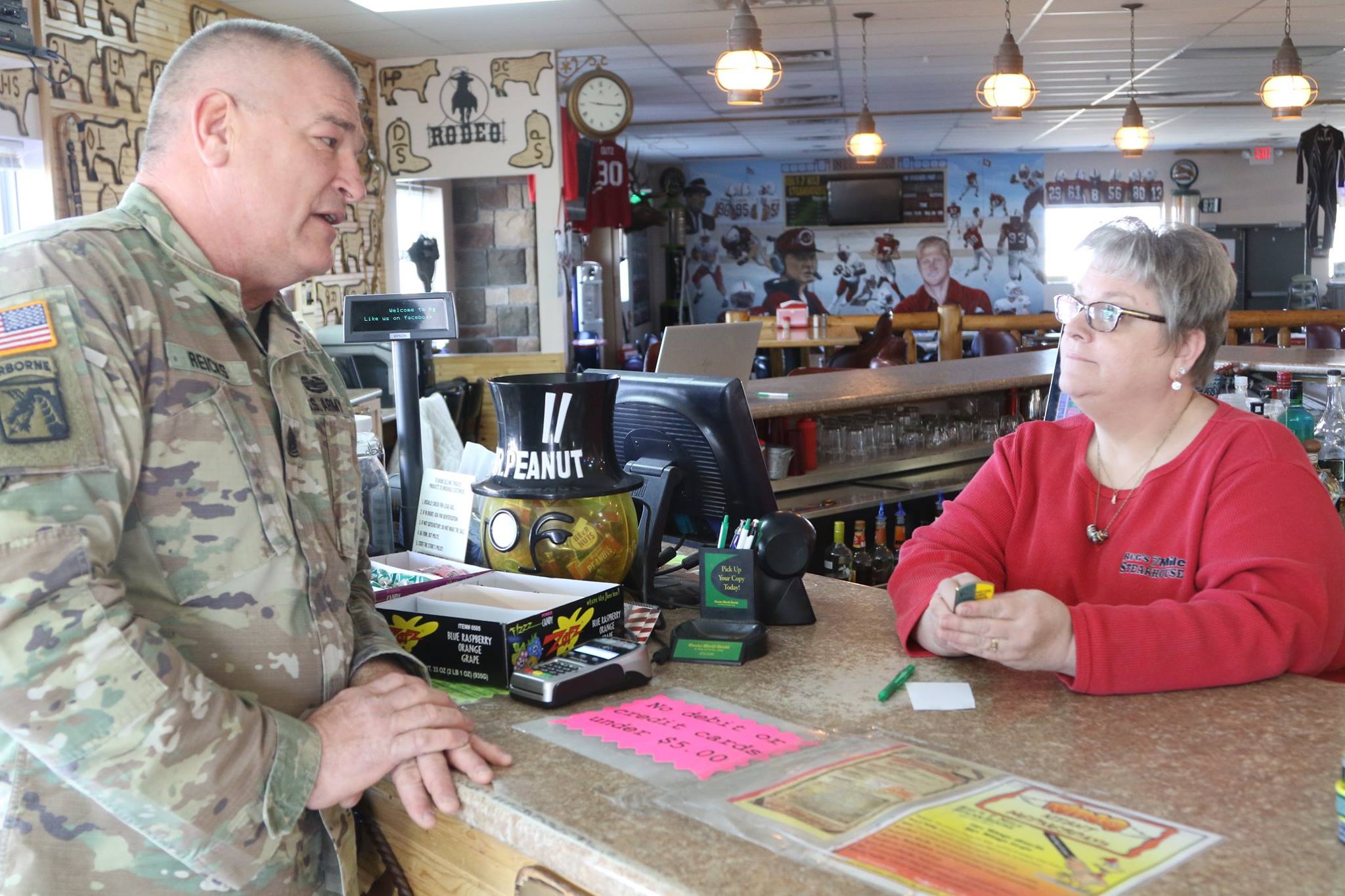 During his visits, he spoke with local community members who had come together to support others following the flood, including Nekl. Reicks recognized Nekl with a brigade coin for the restaurant’s gracious support of the Soldiers during flood relief operations. He also recognized Soldiers who had performed above and beyond regular mission duties while helping out during the flood response.